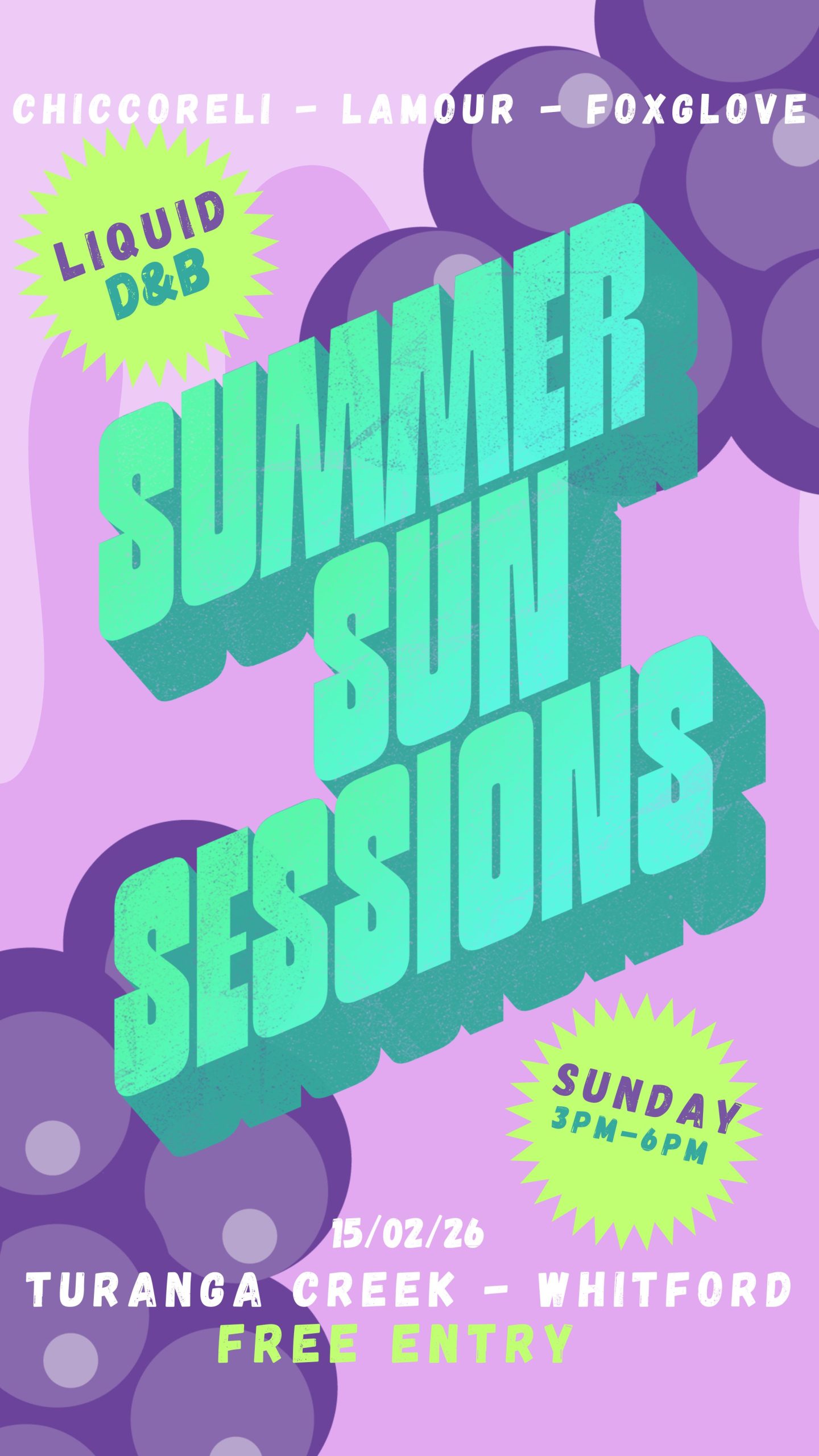 Turanga Creek VineyardSummer Sun Session in the Vines Sunday, 15th February 2025 3pm until 6pm FREE ENTRY (RSVP BELOW) 3 DJs • drum and bass, 3 Hours Bring a picnic, or purchase food from Turanga Creek Vineyard. Tapas boxes are also available for pre purchase. You are welcome to bring picnic chairs and/or shade. The vineyard bar …