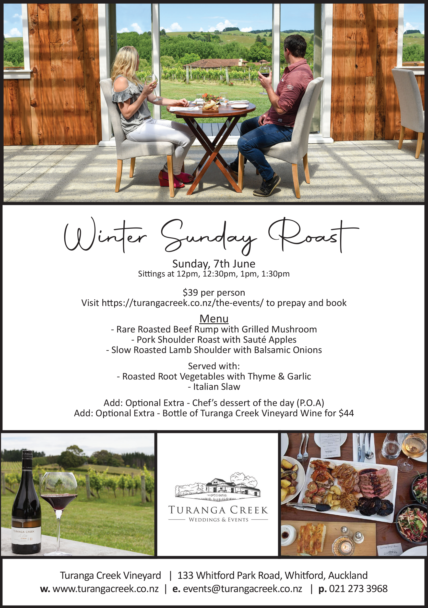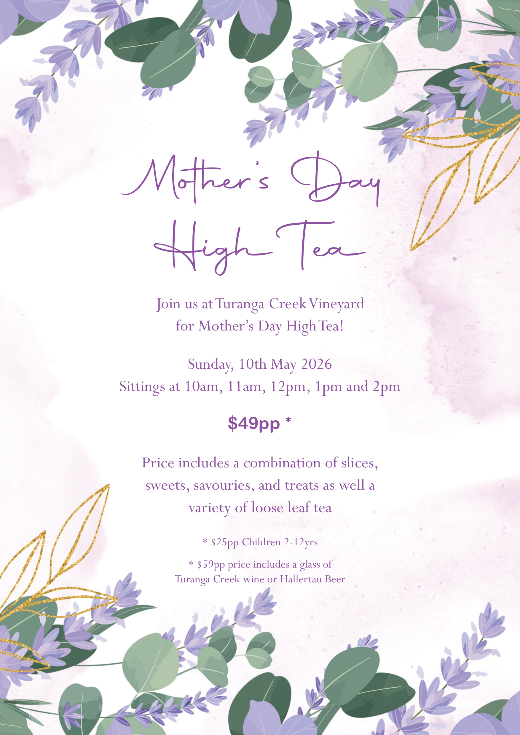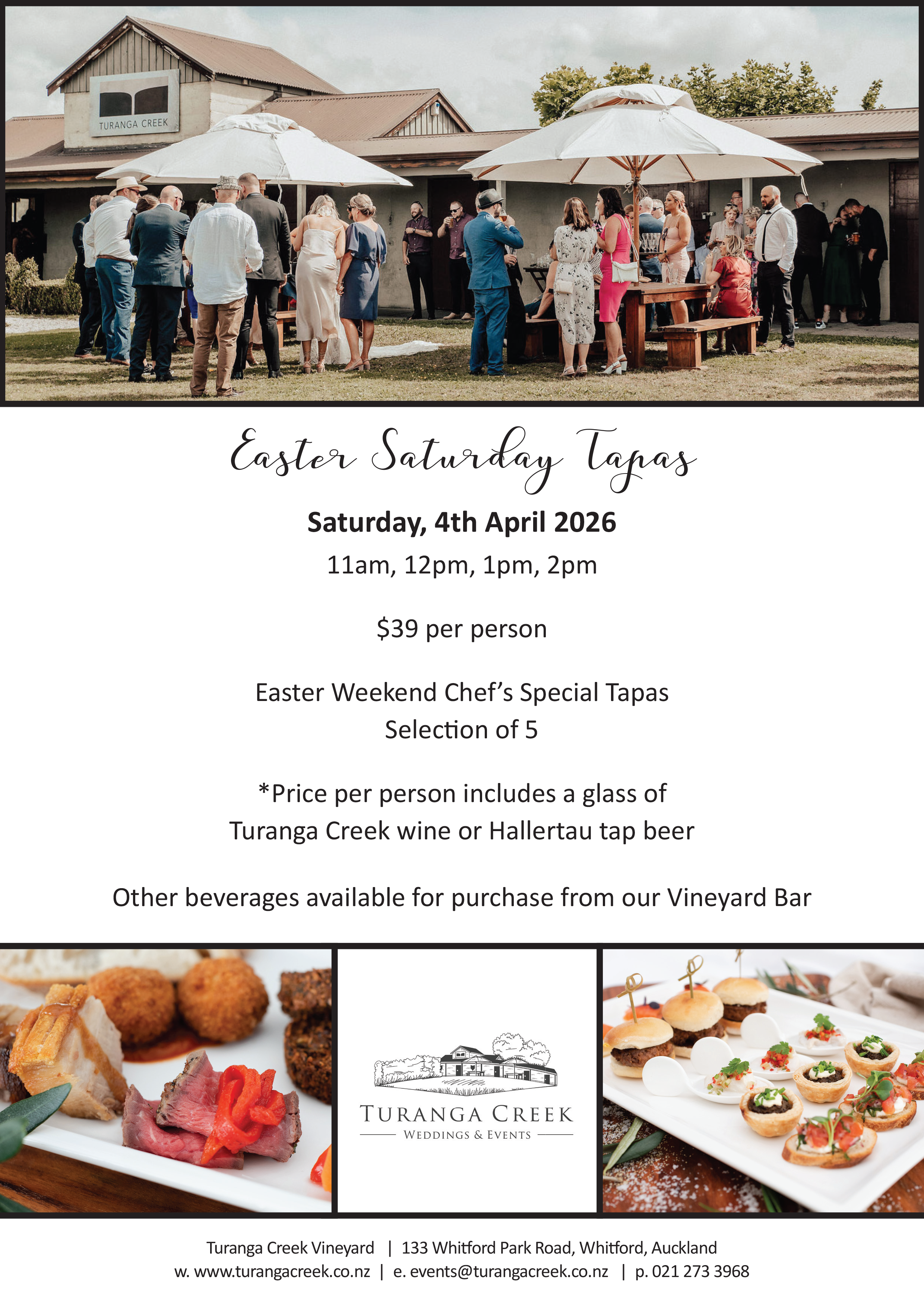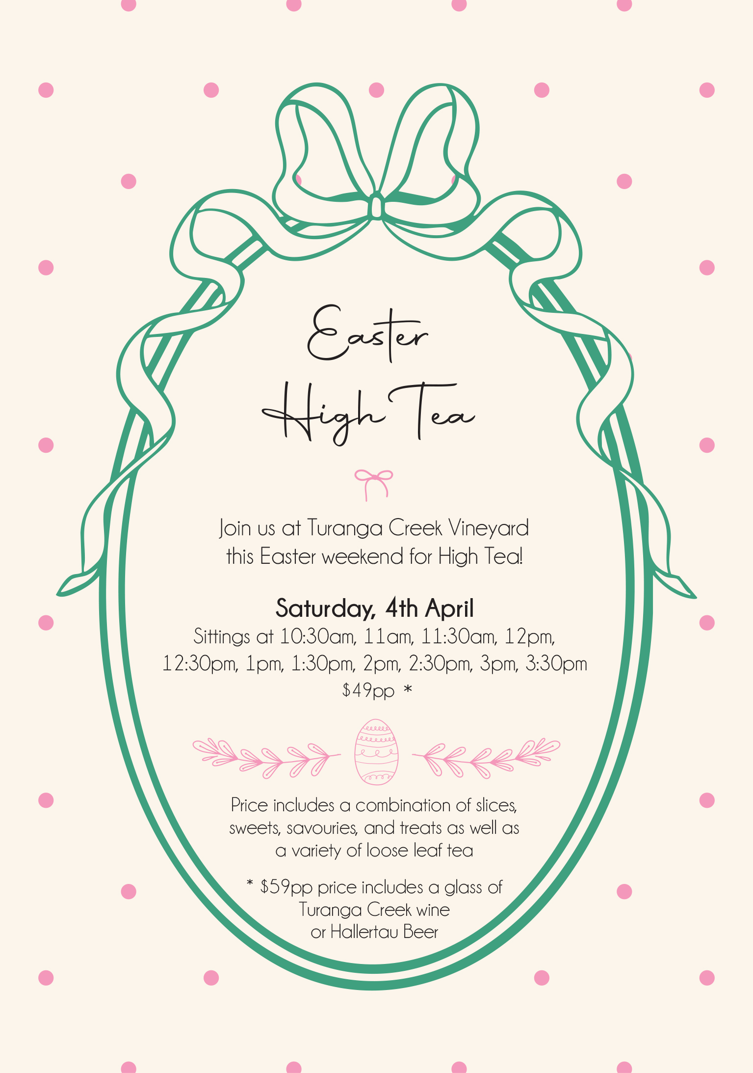 Turanga Creek VineyardJoin us at Turanga Creek Vineyard this Easter Weekend for High Tea! Saturday, 4th April 2026 Sittings at 10:30am, 11am, 11:30am, 12pm, 12:30pm, 1pm, 1:30pm, 2pm, 2:30pm, 3pm, 3:30pm $49pp * Price includes a combination of slices, sweets, savouries, and treats as well a variety of loose leaf tea * $59pp price includes a glass …